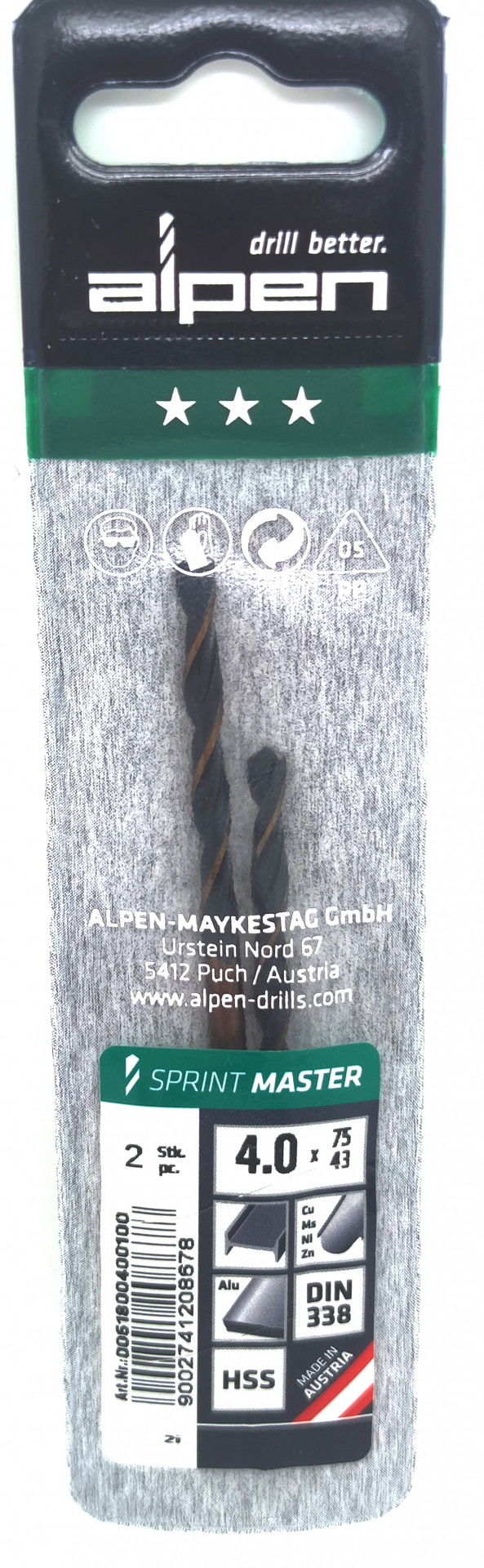 Alpen Csigafúró HSS Sprint Master DIN 338 4.0x75x43mm 2db/csomag 1232320