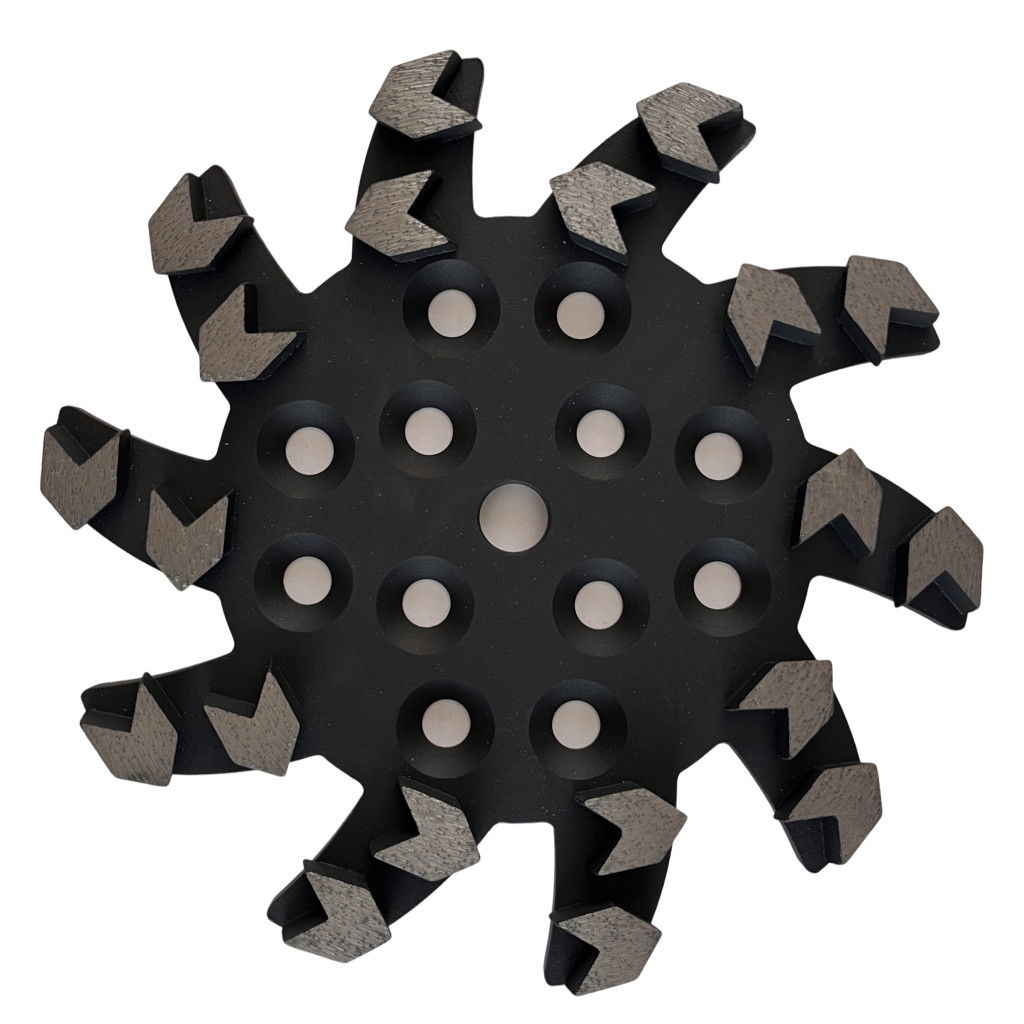 Prémium minőségű, 250 mm-es gyémánt csiszoló tárcsa padlócsiszoló gépekhez. 20 db, 12 mm magas V-alakú szegmense gyors és agresszív csiszolást biztosít kemény betonon, miközben extra hosszú élettartamot garantál. Univerzális felfogatással minden elterjedt padlócsiszoló gépen használható.
