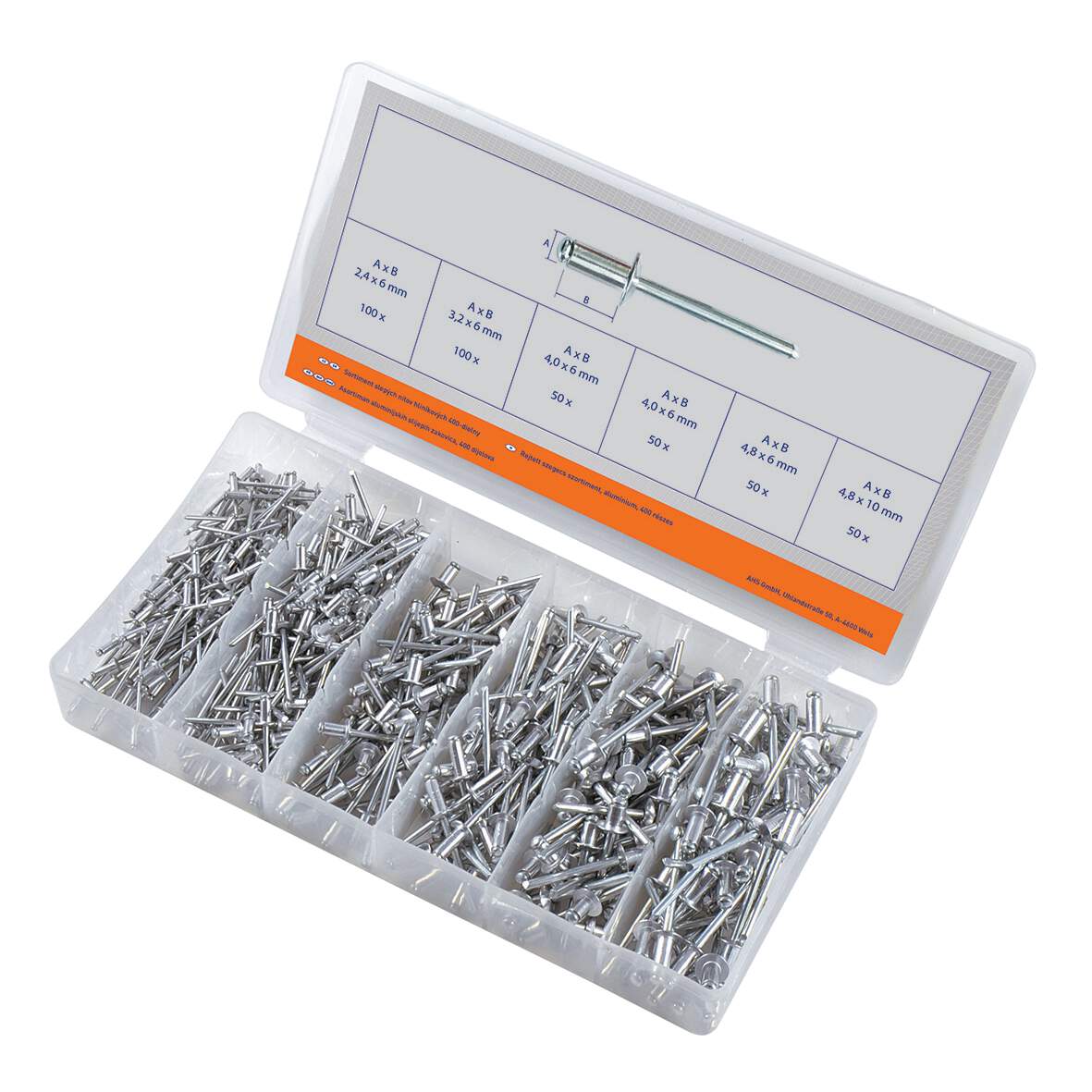 - tartalom: 2,4x6mm/100db, 3,2x6mm/100db, 4x6mm/50db, 4x10mm/50db, 4,8x6mm/50db, 4,8x10mm/50db Anyag: